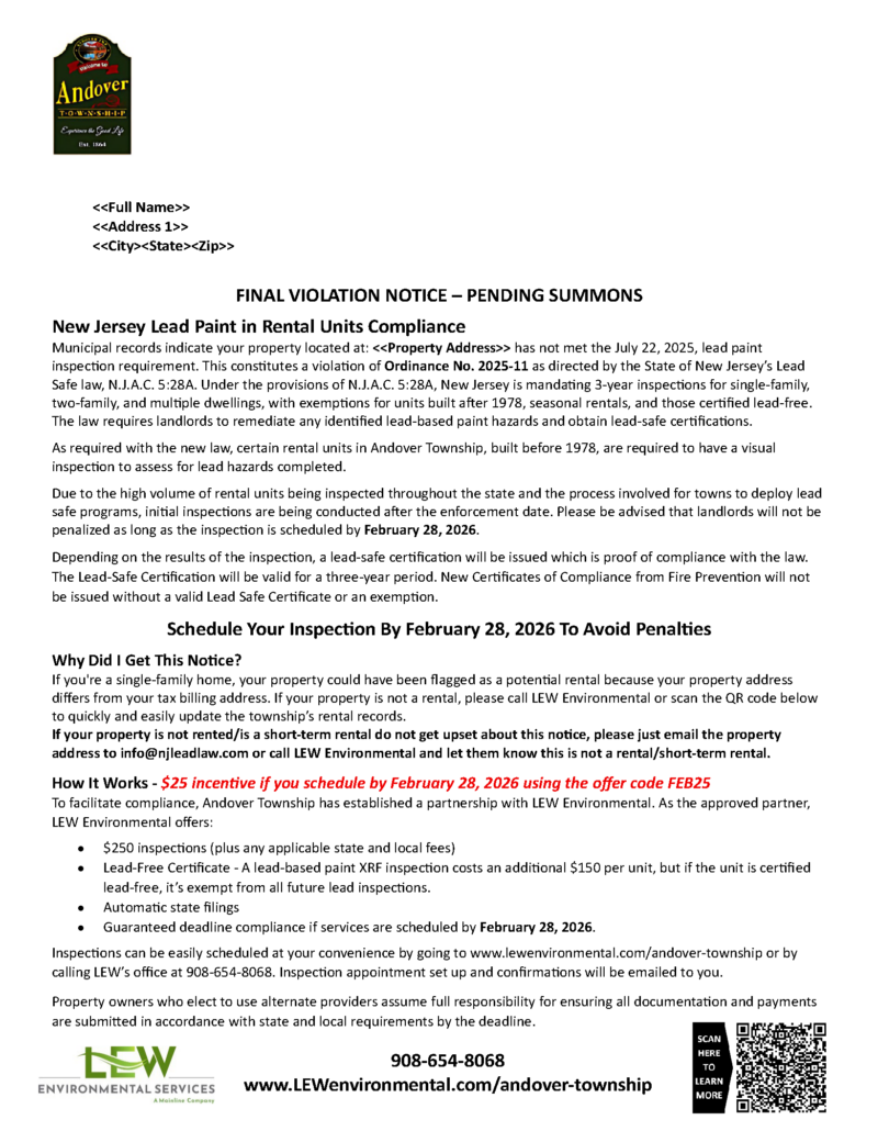 Andover Township has partnered with LEW Environmental to provide a cost-effective solution for NJ’s Lead Safe Certification Law. If you received a letter then municipal records indicate one of your rental properties is impacted by this new law.