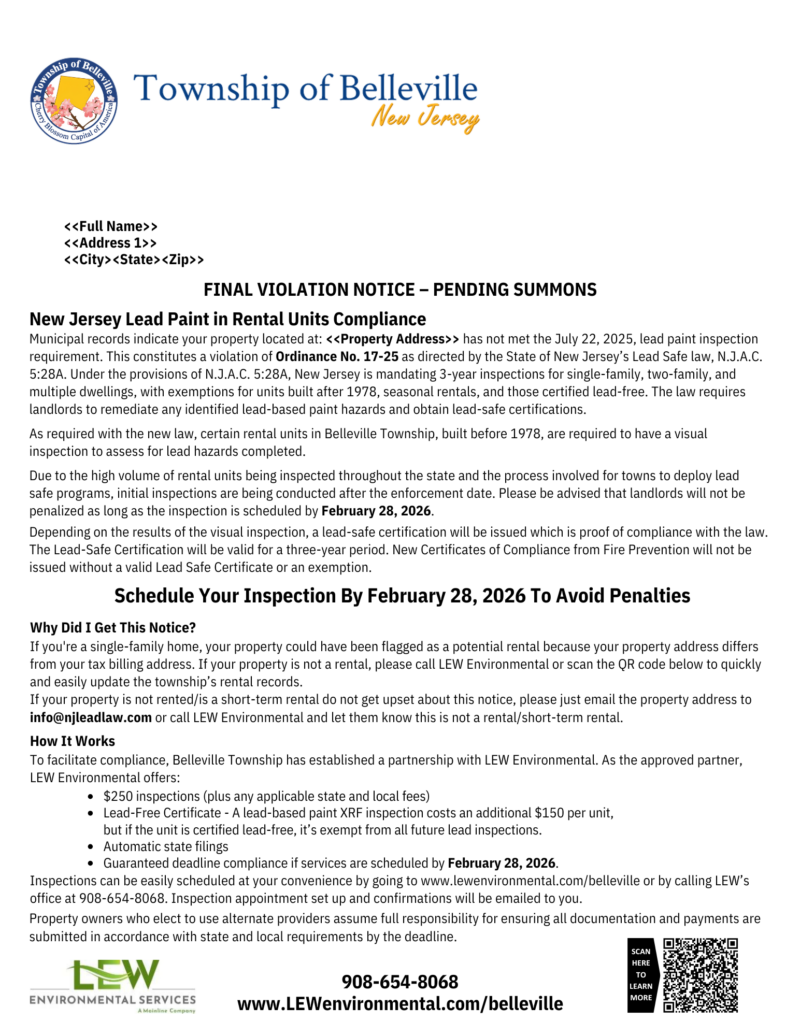 Belleville Township has partnered with LEW Environmental to provide a cost-effective solution for NJ’s Lead Safe Certification Law. If you received a letter then municipal records indicate one of your rental properties is impacted by this new law.
