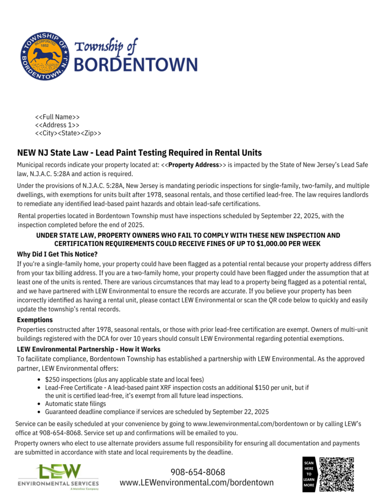 Bordentown Township has partnered with LEW Environmental to provide a cost-effective solution for NJ’s Lead Safe Certification Law. If you received a letter, then municipal records indicate one of your rental properties is impacted by this new law.