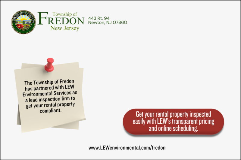 The Township of Fredon has partnered with LEW Environmental to provide a comprehensive solution to ensure compliance with the new NJ law. If you received a notice then borough records indicate one of your rental properties is impacted by this new law.