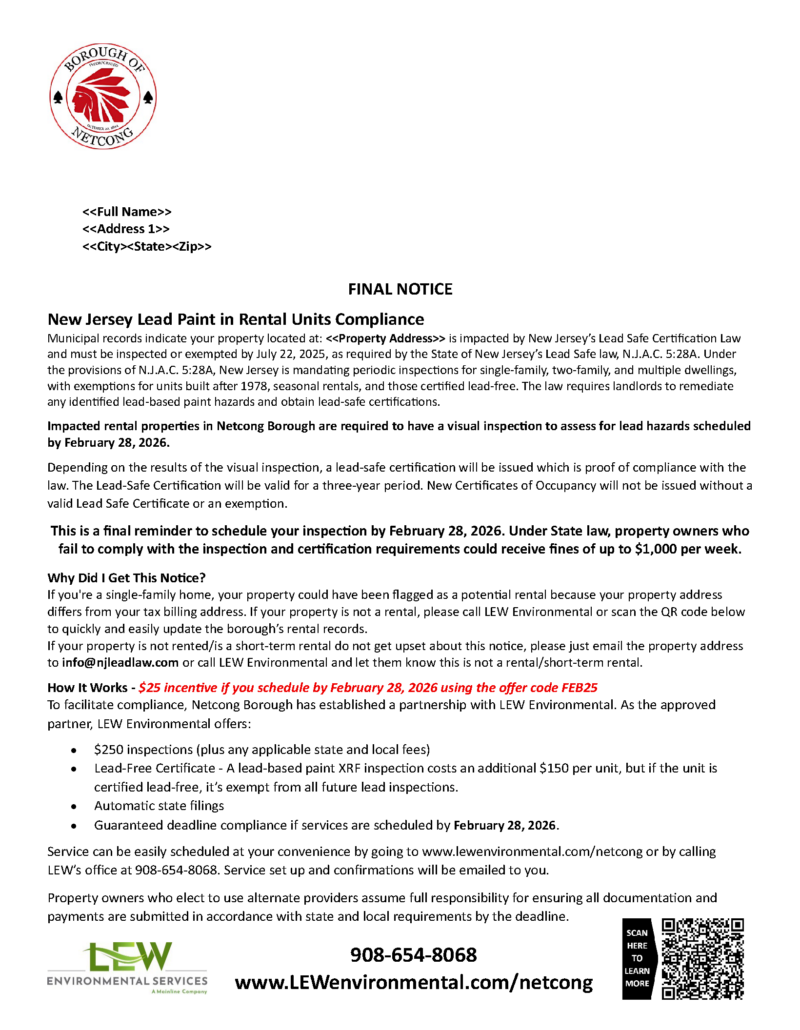 Netcong Borough has partnered with LEW Environmental to provide a cost-effective solution for NJ’s Lead Safe Certification Law. If you received a letter then municipal records indicate one of your rental properties is impacted by this new law.