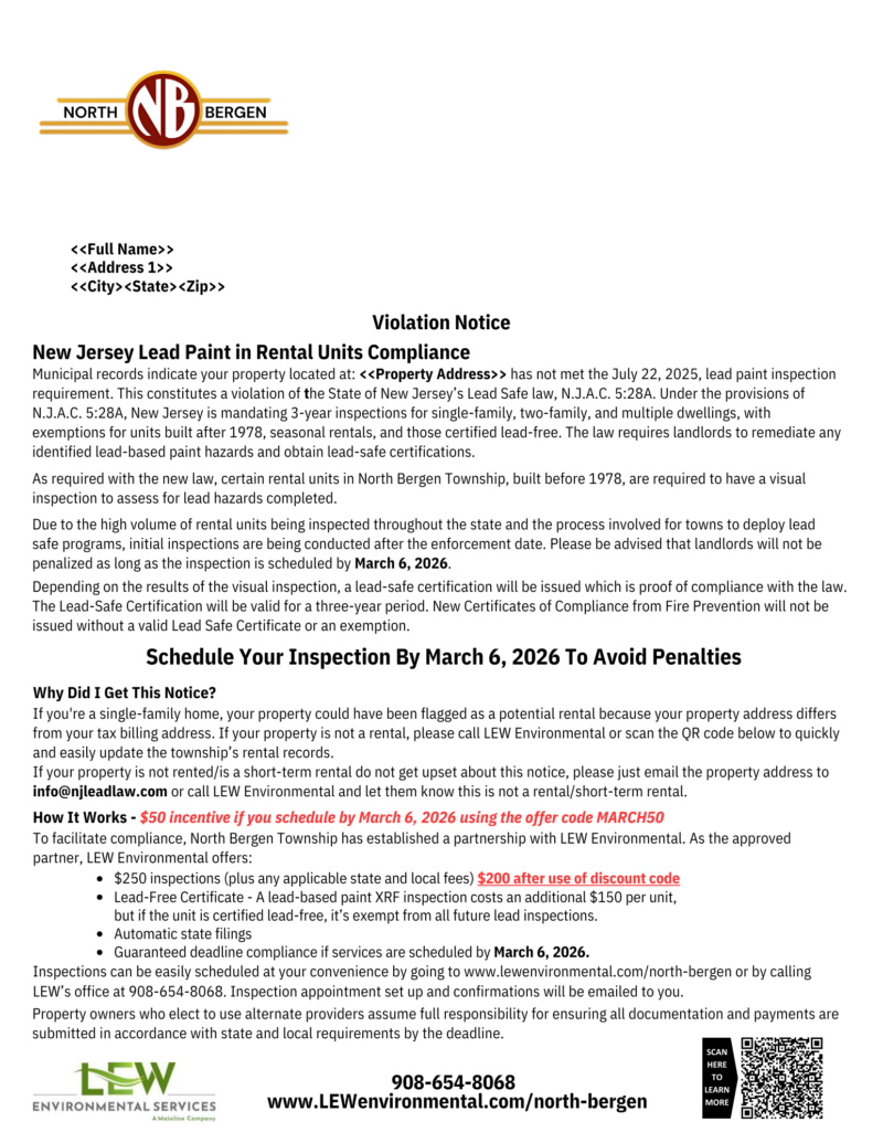 North Bergen Township has partnered with LEW Environmental to provide a cost-effective solution for NJ’s Lead Safe Certification Law. If you received a letter then municipal records indicate one of your rental properties is impacted by this new law.