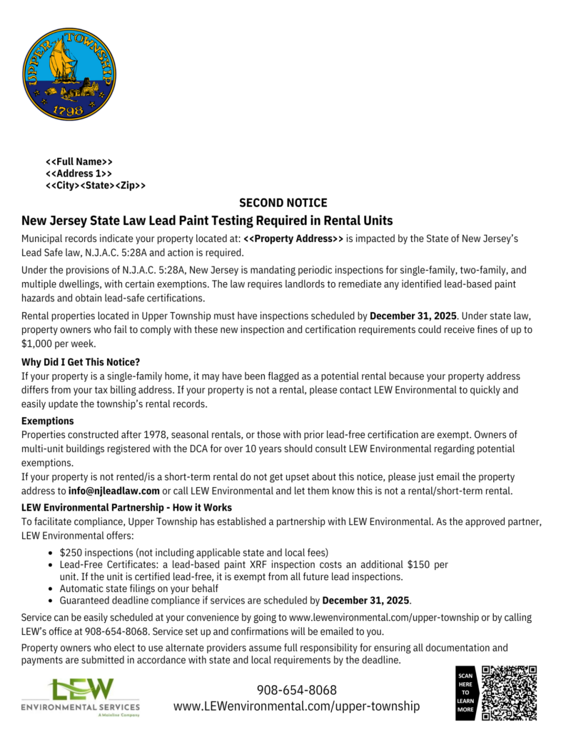 Upper Township has partnered with LEW Environmental to provide a cost-effective solution for NJ’s Lead Safe Certification Law. If you received a letter then municipal records indicate one of your rental properties is impacted by this new law.